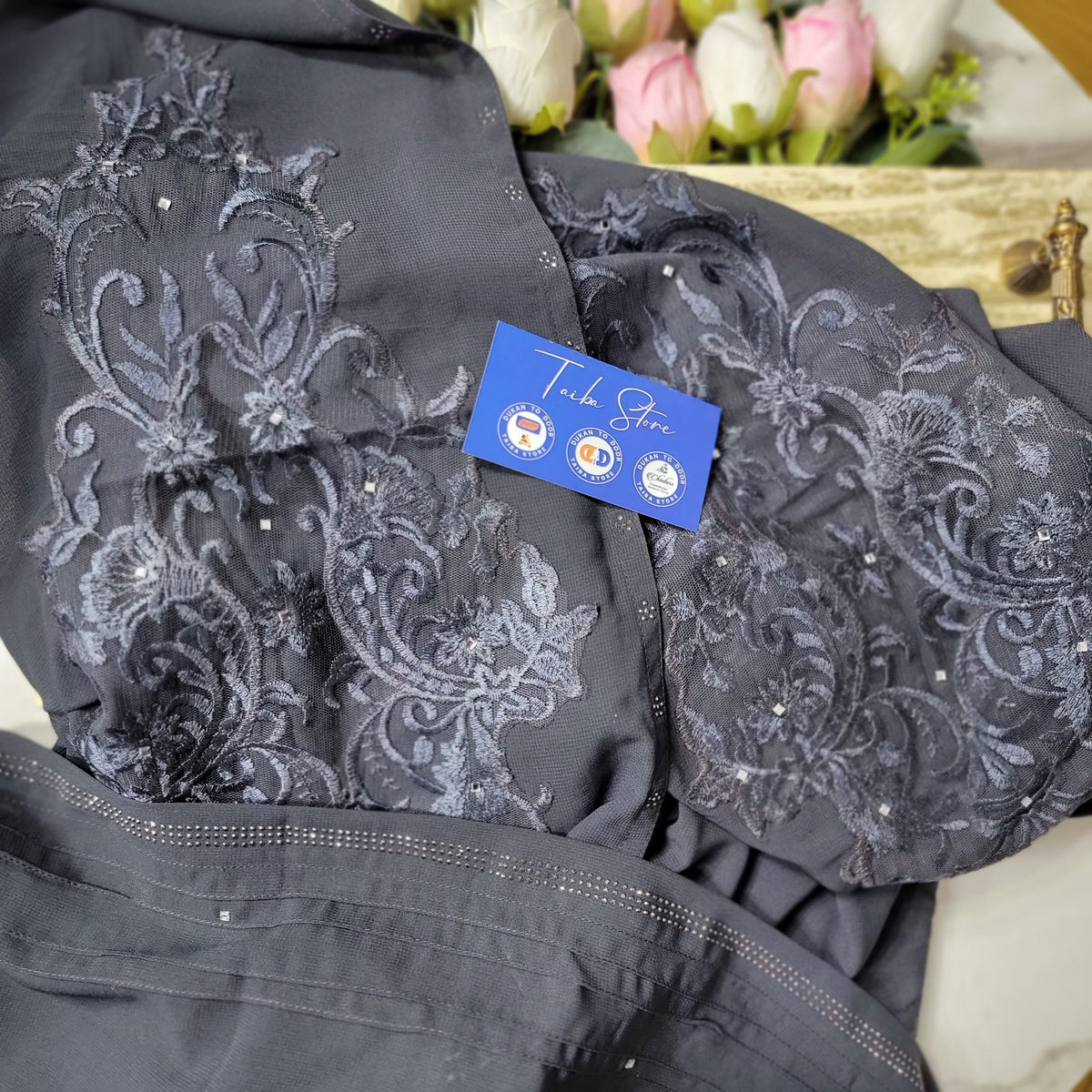 Timeless elegance to your special moments with our Charcoal Royale Applique. crafted on premium Korean chiffon and adorned with exquisite designer lacework. This bridal-inspired piece features beautifully detailed cutwork lace, delicate motifs, and fine stone embellishments that add a luxurious, radiant touch.